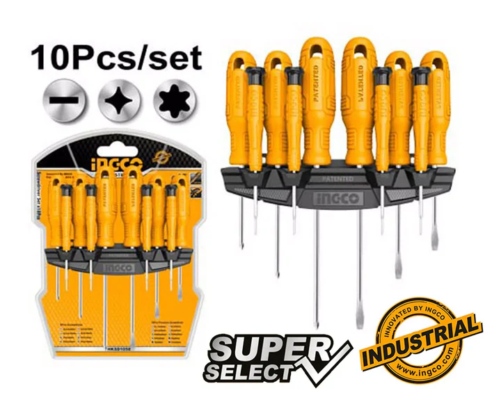 Jeu de 10 tournevis à main INGCO HKSD1058 – Acier Cr-V, Poignées ergonomiques, Embouts plats et cruciformes