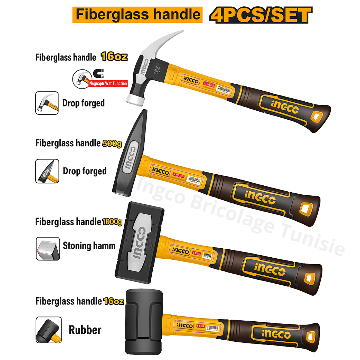 Jeu de 4 marteaux INGCO HCH9004 – Forgés, manches en fibre de verre, 3,2 kg