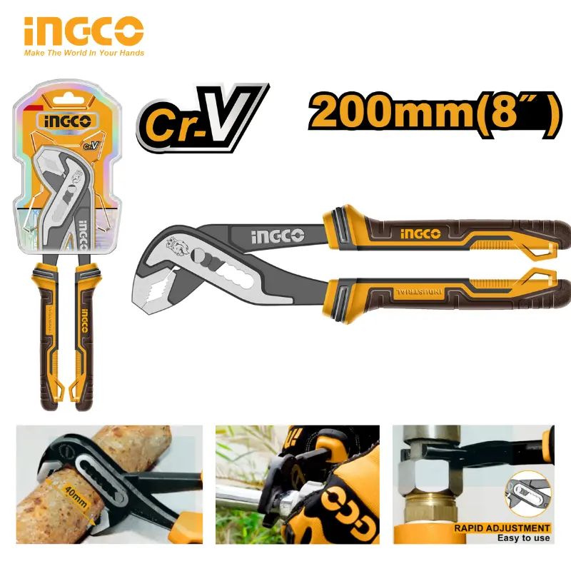 Pince à pompe INGCO 8″ HPP28208 – Acier Cr-V, Poignée TPR tricolore, Serrage jusqu’à 35 mm