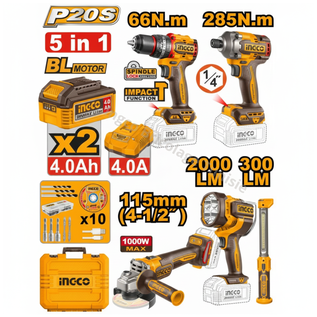 Kit combiné 5 pièces Perceuse à percussions, Clé à chocs, meuleuse d’angle, 2 Lampe de travail : Brushless