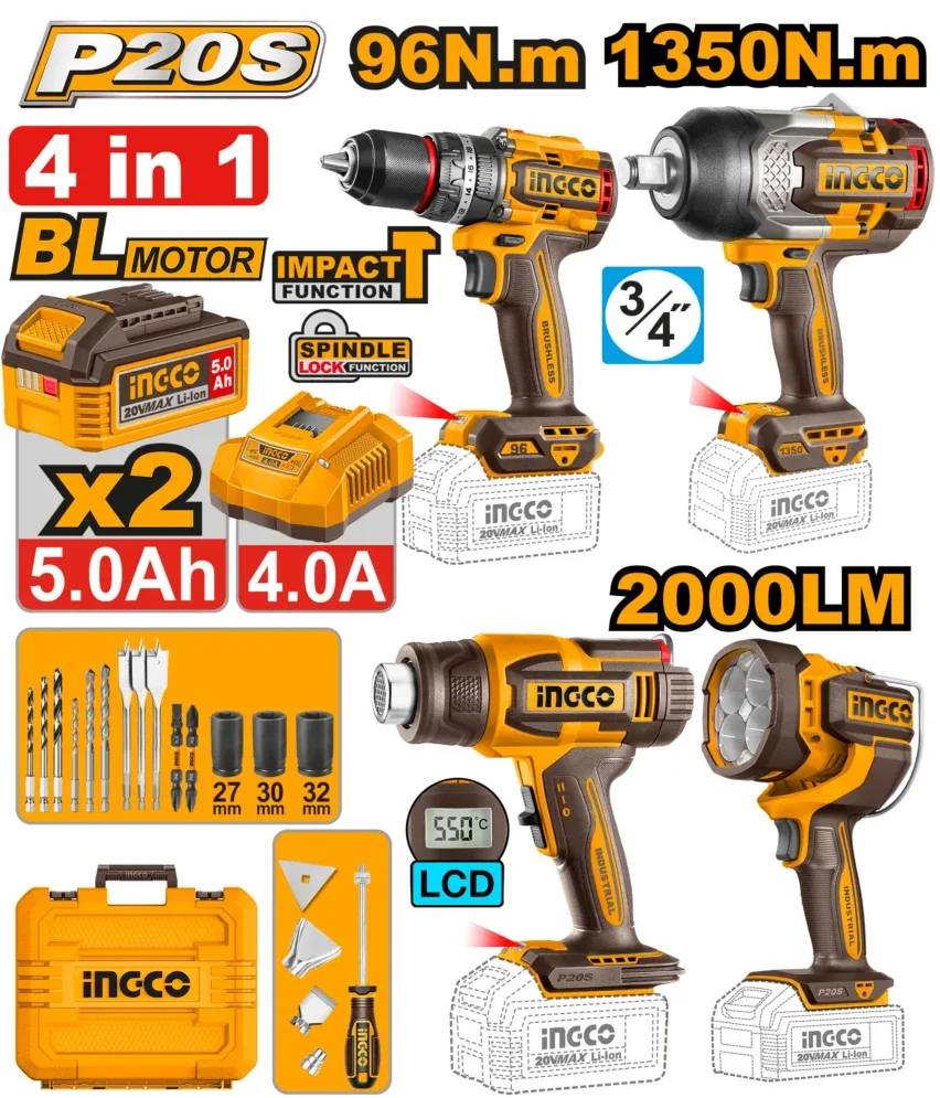 Kit combo 4 pieces Perceuse à percussion, Clé à chocs, Pistolet thermique, Lampe de travail : Brushless