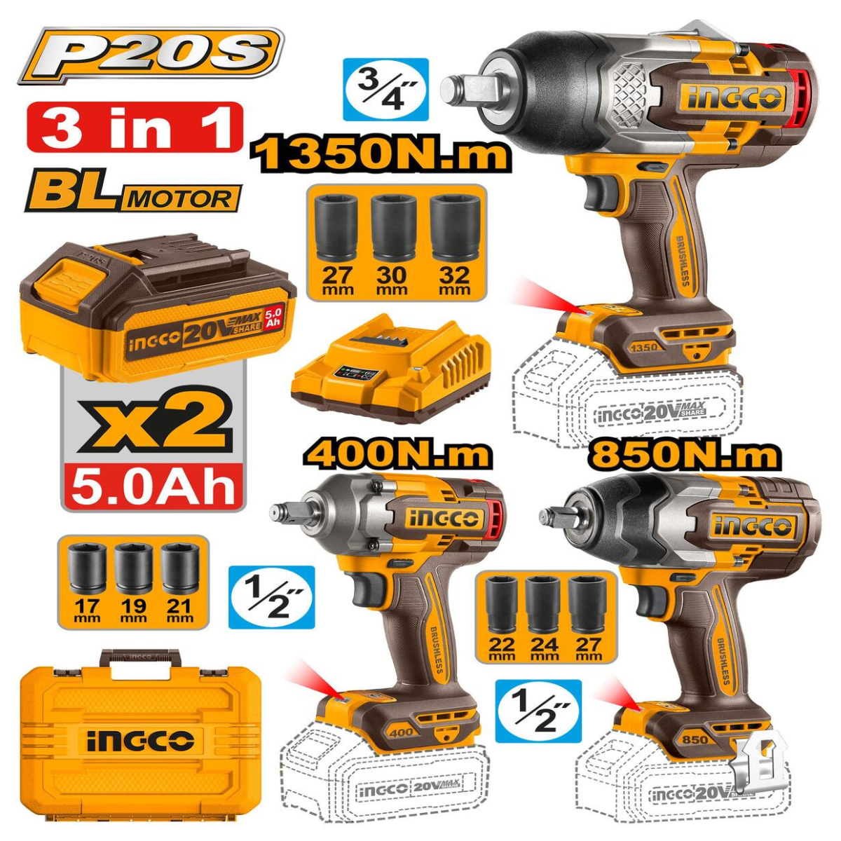 pack combo 3 clés à chocs sans fil INGCO (COSLI250386) — 20 V, puissances 400 Nm / 850 Nm / 1350 Nm, livré avec batteries, chargeur et coffret. Parfait pour les travaux mécaniques, auto, atelier.